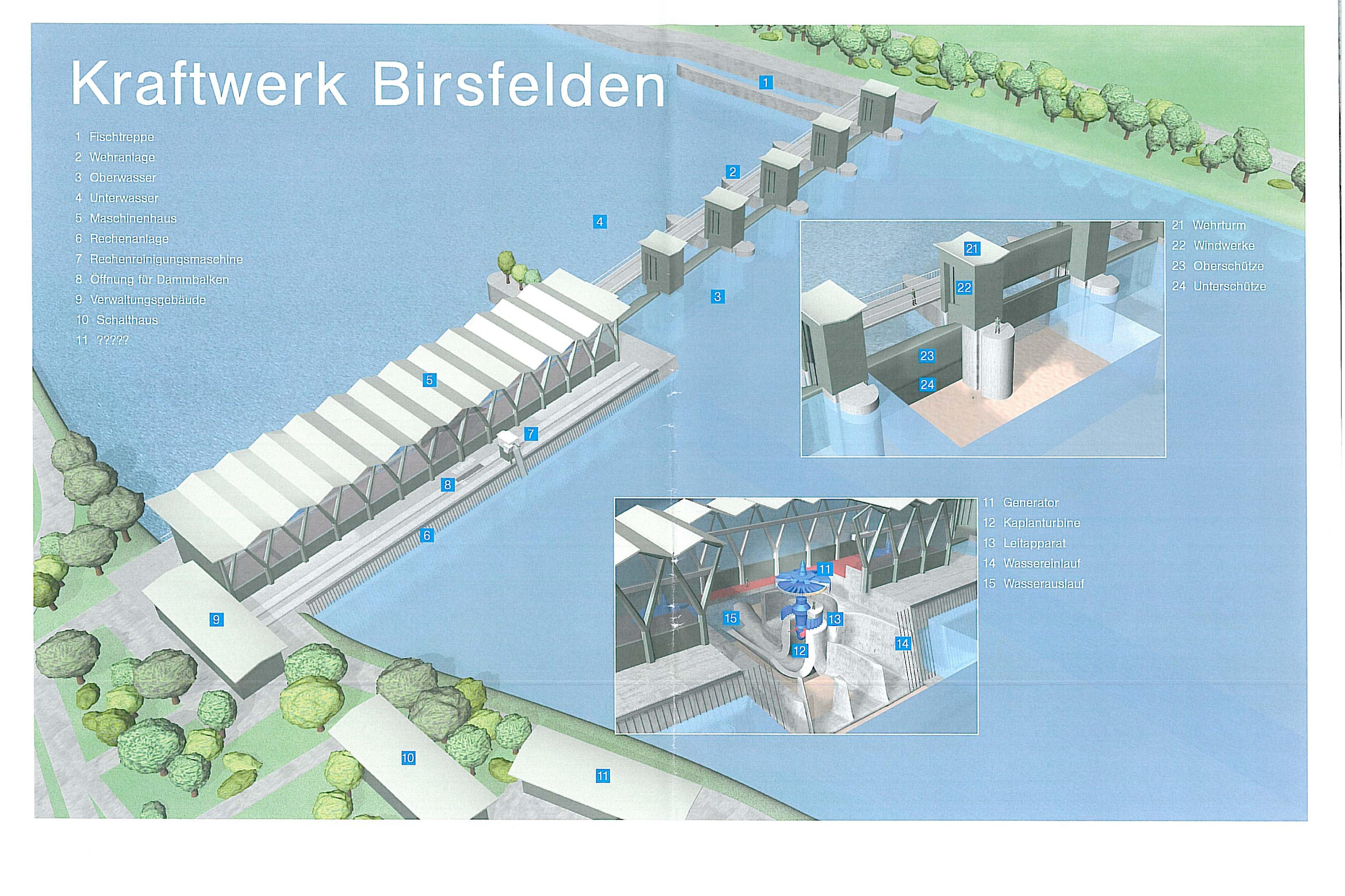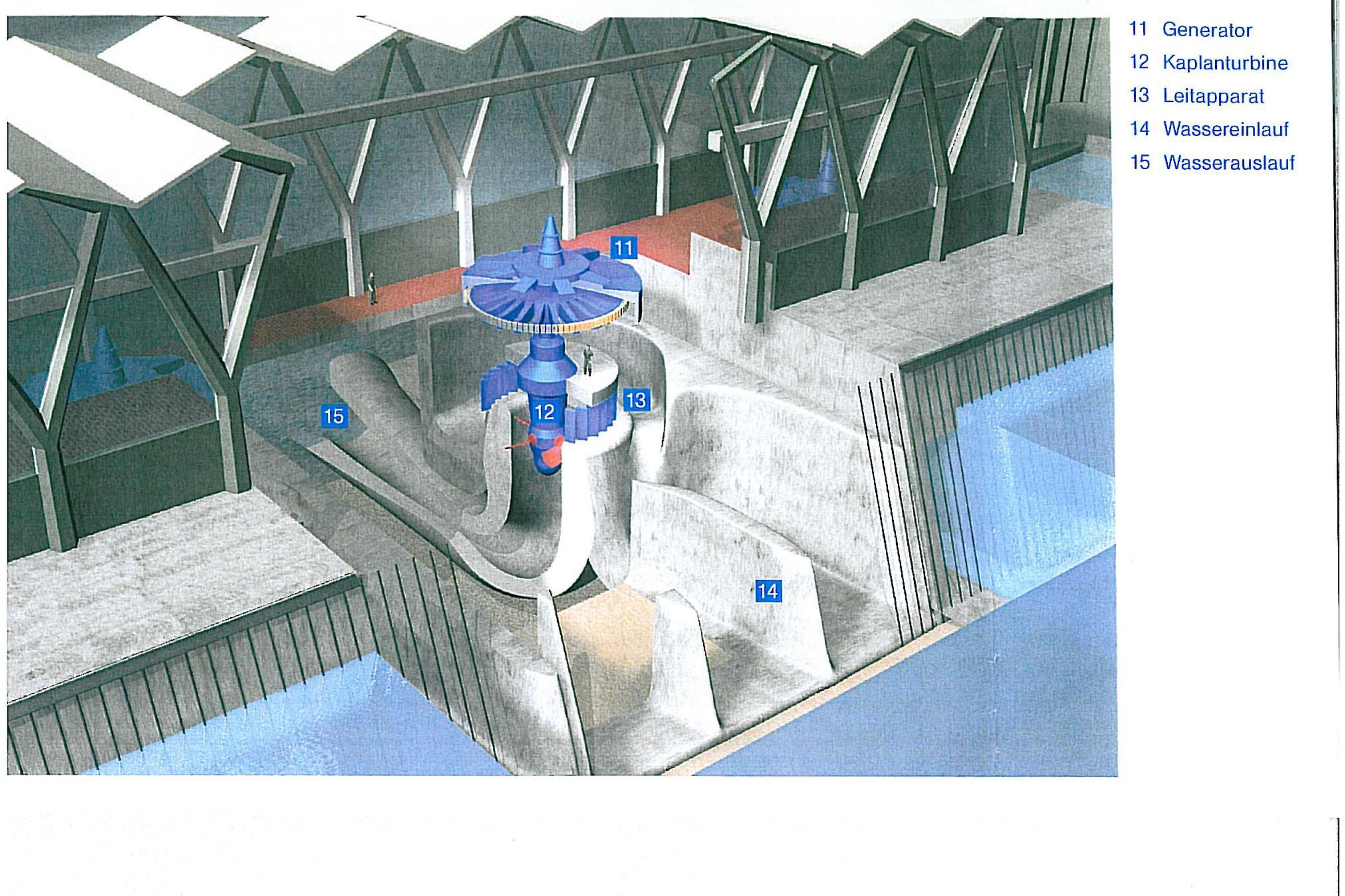 Vier Maschinengruppen betreibt das Kraftwerk Birsfelden. Die darin eingebauten Kaplanturbinen stehen vertikal zum Flussverlauf. Die technischen Leistungen überzeugen.